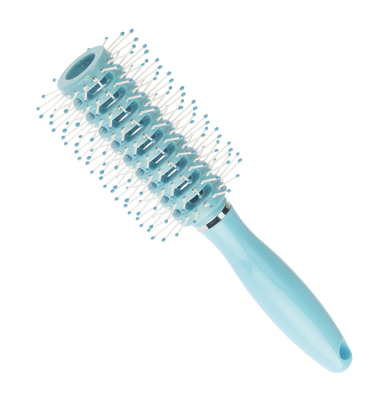Брашинг DEWAL выполнен в черно-голубом цвете из глянцевого пластика. Нейлоновые штифты идеально подходят для бережной укладки. Для волос средней длины.