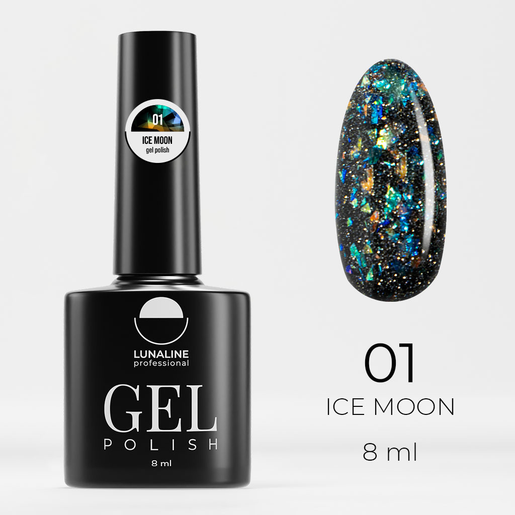 Гель-лак ICE MOON имеет светоотражающий эффект с добавлением иридирующего битого стекла.