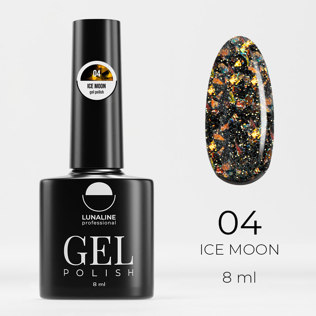 Гель-лак ICE MOON имеет светоотражающий эффект с добавлением иридирующего битого стекла.