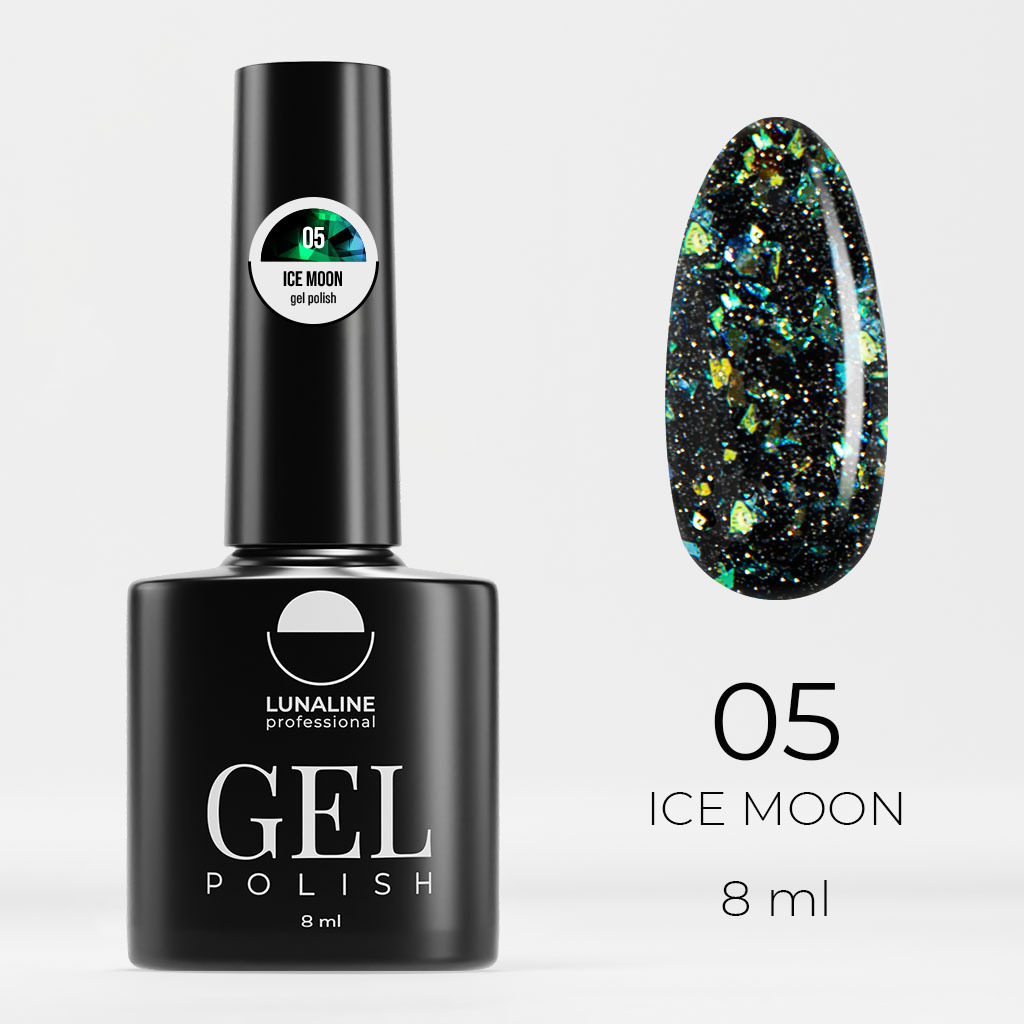 Гель-лак ICE MOON имеет светоотражающий эффект с добавлением иридирующего битого стекла.