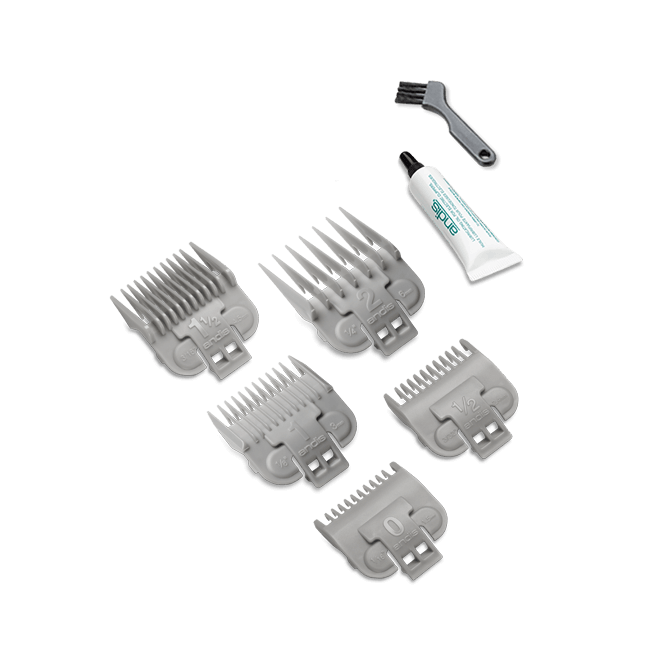 Пять дополнительных уровней длины от 1,5 до 6 мм доступны с входящими в комплект насадками. Отдельно продаются наборы совместимых магнитных насадок 1,5-13 мм, 16-25 мм или набор из 11 насадок Andis Snap-On 66565.