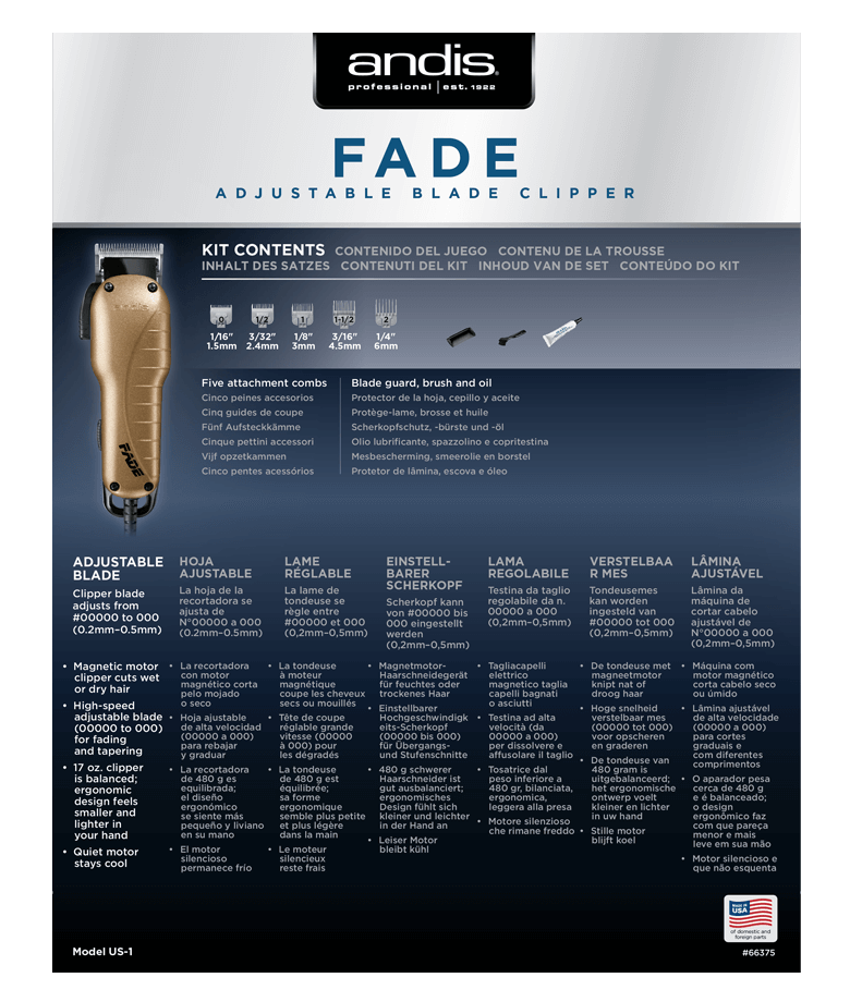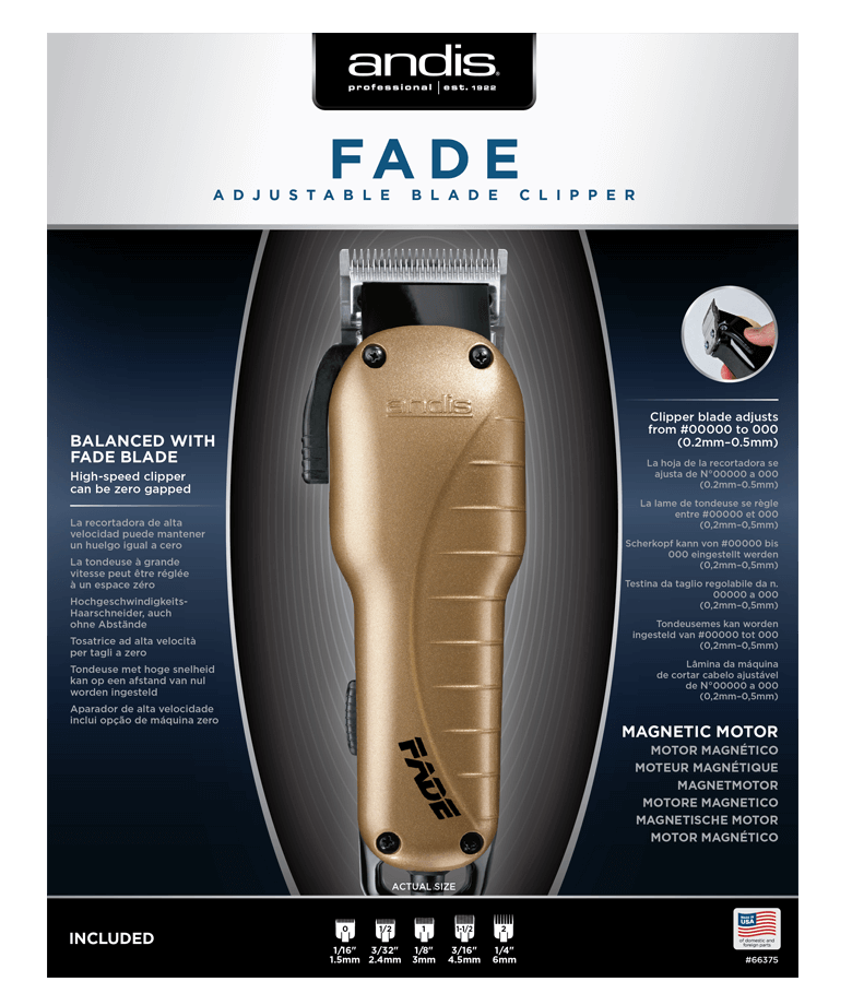 Парикмахерская машинка Andis Fade Adjustable US-1 Metallic Gold комплектуется плоским регулируемым ножом для стрижки техникой «фейдинг». Модель Fade снабжена эффективным вибрационным магнитным мотором — работает тихо и долго остается холодным. Рекомендована для плавных переходов с нуля или коротких стрижек. Дает легкий срез на сухих или влажных волосах — толстых или тонких.