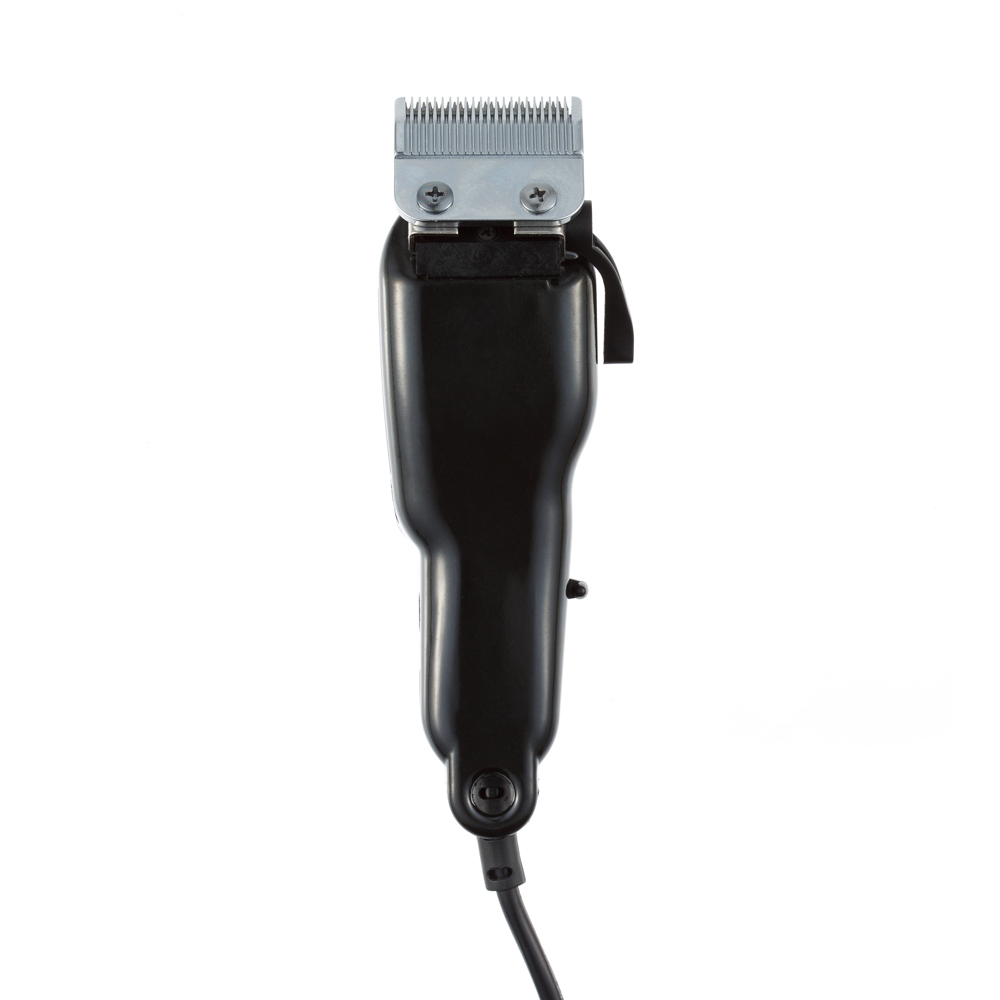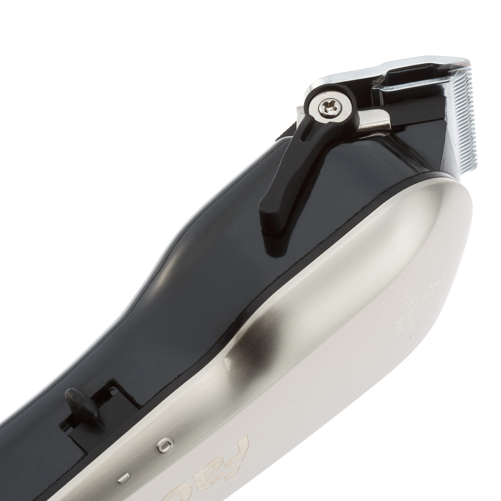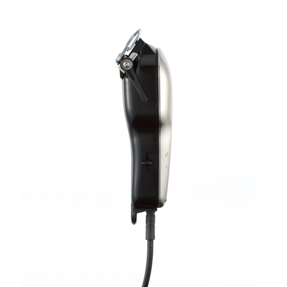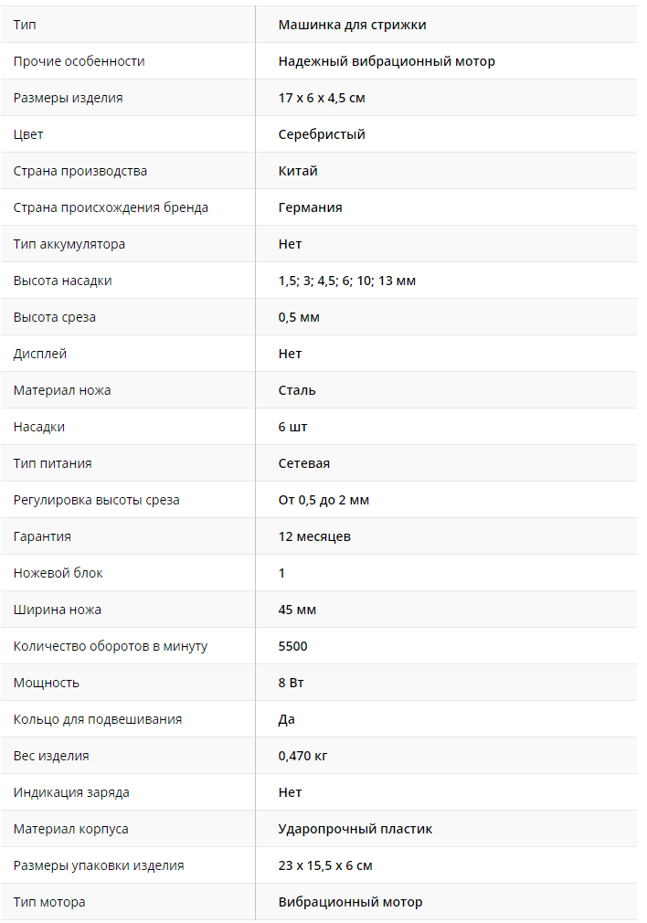 Мощность мотора можно отрегулировать с помощью винта, который находится с правой стороны корпуса. Ножевой блок выполнен из стали, отсутствие четких делений на рычаге регулировки среза позволяет выбрать огромное количество вариантов и делать плавные переходы без насадок от 0,5 до 2 мм. В комплекте есть необходимые барберу насадки 1,5 и 4,5 мм.