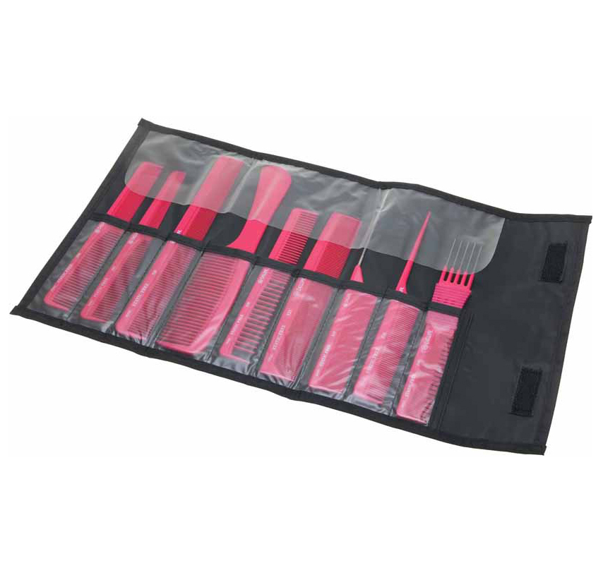 Набор расчесок DEWAL состоит из 9 предметов красного цвета в чехле на липучке.