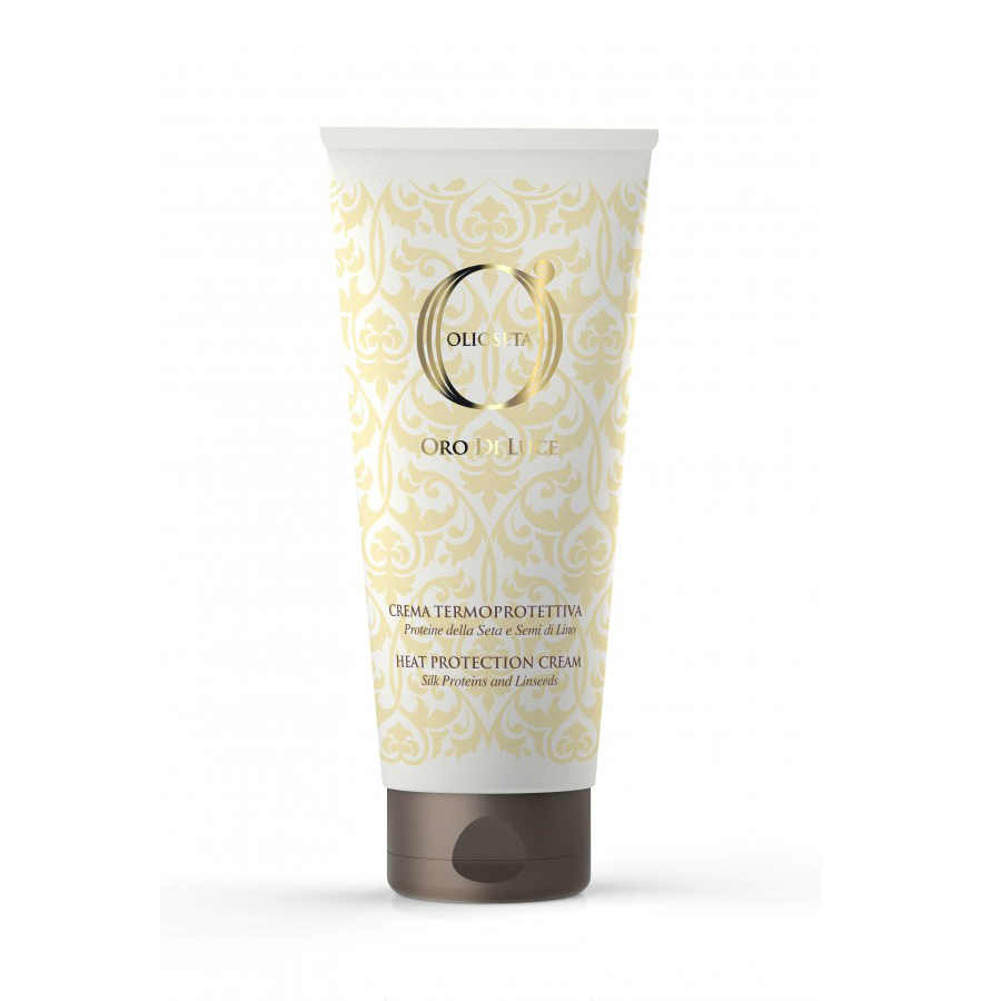 Термозащитный крем для волос с протеинами шелка и семенем льна Barex Italiana Heat protection cream Olioseta Oro Di Luce. Несмываемый крем с бархатистой текстурой для защиты волос от воздействия тепла фена, утюжков и щипцов для волос. Придает волосам гладкость, устраняет пушистость, без эффекта утяжеления.