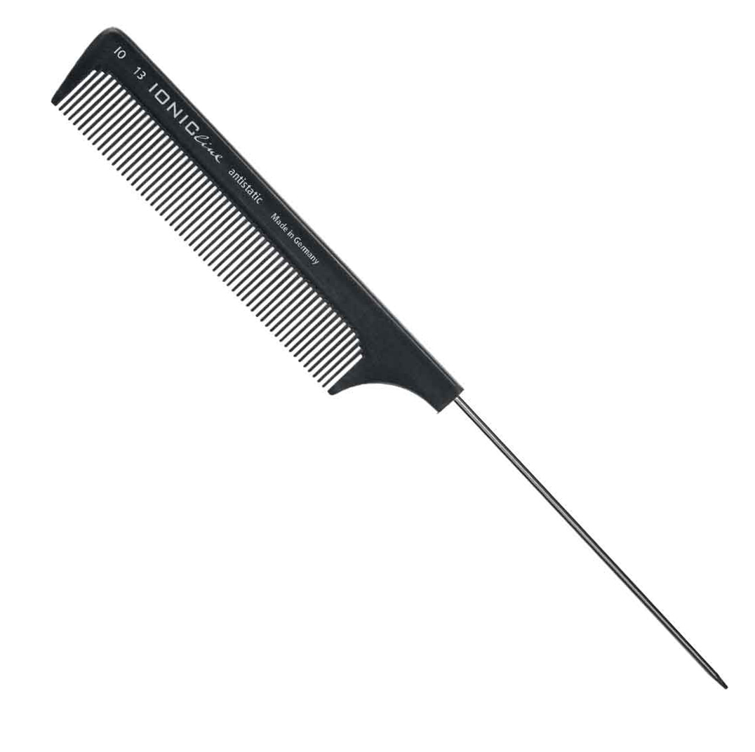 Профессиональная расчёска Ionic Line Triumph из поликарбоната с технологией ионизации, эластичная и прочная, устойчива к высоким температурам, не деформируется при использовании с химически активными веществами, антистатична. Идеально гладкая обработка зубьев лёгко скользит по волосам, не повреждая их при расчёсывании. Расчёска-хвостик с металлическим штифтом для удобства стилиста и очень плотными зубьями одной длины подходит для коротких стрижек, тушёвки, причёсок, плетений, начёса, сложных укладок, мелирования. Благодаря совершенной эргономике, её удобно держать в руке.