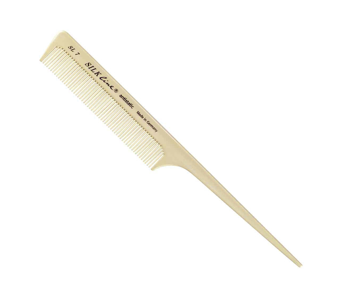 Расческа с хвостиком силиконовая от Triumph оказывает минимальное агрессивное воздействие на луковицы волос и кожу головы. Силикон, используемый компанией Triumph для этой серии расчёсок, обеспечивает великолепное скольжение по волосам, а так же является высокопрочным, гибким, термо и химически устойчивым материалом. Кроме того, расческа имеет гипоаллергенное антистатичное покрытие. Расческа применяется при накручивании волос на бигуди, при начесе, укладке волос и при оформлении сложных причесок. Тонкий хвостик позволяет быстро и равномерно разделить волосы на пряди.