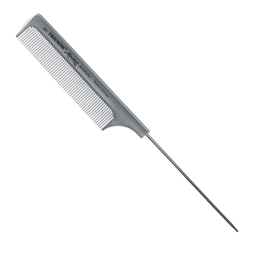 Профессиональная расчёска Master Triumph из высококачественной пластмассы, гибкая и прочная, устойчива к высоким температурам, не деформируется при использовании с химически активными веществами, антистатична. Идеально гладкая обработка зубьев лёгко скользит по волосам, не повреждая их при расчёсывании. Расчёска-"хвостик" с металлическим штифтом и зубьями одной длины подходит для коротких стрижек, тушёвки, причёсок, плетений, начёса, сложных укладок, мелирования. Благодаря совершенной эргономике, её удобно держать в руке.