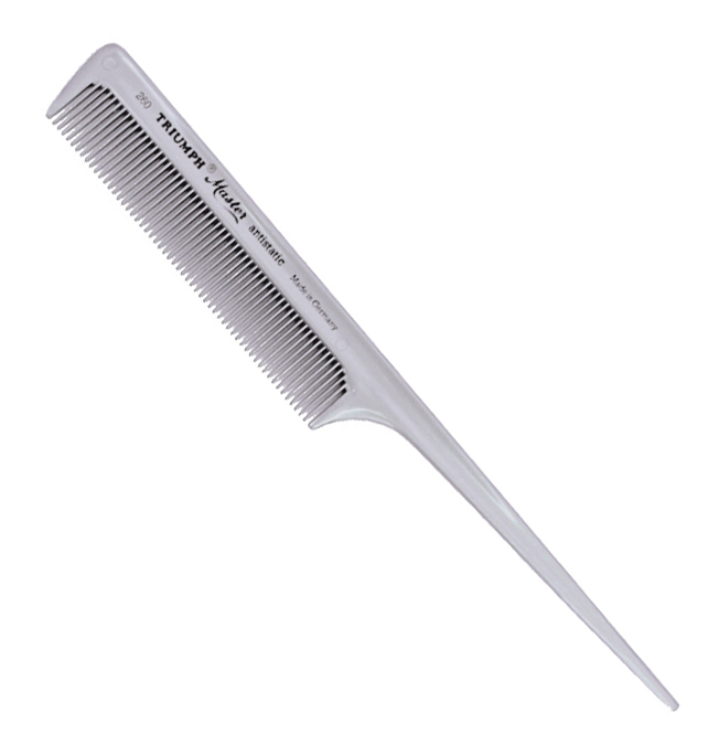 Профессиональная расчёска Master Triumph из высококачественной пластмассы, гибкая и прочная, устойчива к высоким температурам, не деформируется при использовании с химически активными веществами, антистатична. Идеально гладкая обработка зубьев лёгко скользит по волосам, не повреждая их при расчёсывании. Расчёска-"хвостик" с очень плотными зубьями одной длины подходит для коротких стрижек, тушёвки, причёсок, плетений, начёса, сложных укладок, мелирования. Благодаря совершенной эргономике, её удобно держать в руке.