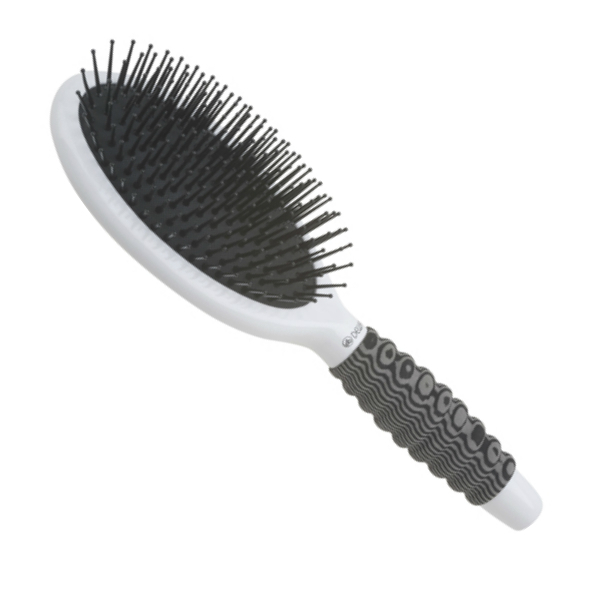 Щетка Dewal белая, массажная, овальной формы с пластмассовыми зубцами, 13-рядов. Имеет мягкую эргономичную ручку. Зубцы довольно подвижны относительно основания. Шарики на концах идеальные — гладкие, без зазубрин. Волосы после расчесывания будут выглядеть ухоженными и пышными. Массажная щетка Dewal бережно расправляет пряди, массирует кожу головы и улучшает кровообращение, не причиняя дискомфорта.
