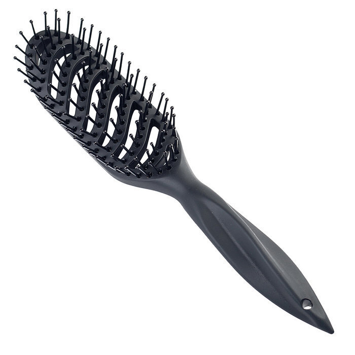 Щетка для укладки DEWAL 9-рядная имеет вогнутую форму. Прорезиненная ручка с покрытием Soft-Touch предотвращает скольжение щетки в руках. Щетка превосходно расчесывает волосы длинные и средней длины, приглаживая пушистые и выпрямляя вьющиеся пряди, а также задает им нужное направление. Разделив шевелюру на 4 части, можно очень быстро и просто, не мучаясь с брашингом и не запутывая волосы, расчесать и одновременно уложить их. Пластиковые зубчики оснащены закруглениями на концах, благодаря которым полностью исключается возможность травмирования кожи.