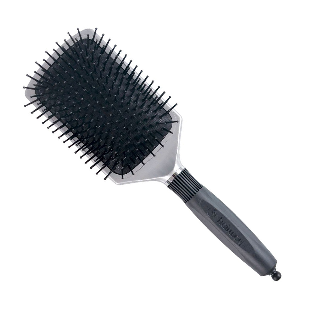 Вообще расческа для волос считается для парикмахера самым простым, но при этом незаменимым инструментом. Щётка массажная Hairway Black Style на пластиковой основе и пластиковыми штифтами идеальна для расчесывания любых волос и массажа кожи головы. Прорезиненная, многогранная ручка позволяет надёжно удерживать щётку во время работы. 13-рядная, широкая прямоугольная. Наличие удобного хвостика-разделителя позволяет сформировать пробор и выделить в прическе отдельные пряди, а по необходимости убирается в ручку. Имеет антистатическое покрытие.