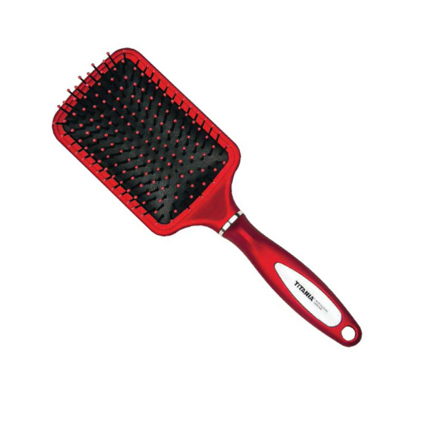 Массажная щетка с пластиковыми штифтами и округлыми наконечниками используется для комфортного расчесывания волос. Материал расчески обладает антистатическим эффектом, благодаря чему при расчесывании волосы не электризуются. Пластиковые штифты на мягкой подушке хорошо массируют кожу головы.
