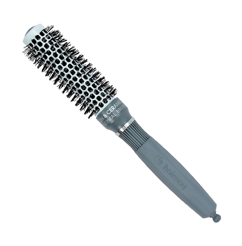Профессиональный облегченный термобрашинг для укладки волос Hairway Ion Ceramic с керамико-ионным покрытиям втулки, нейлоновой щетиной и прорезиненной ручкой для комфортного использования. Брашинг имеет овальные отверстия для более интенсивного прохождения горячего потока воздуха, сокращая тем самым время укладки. Многогранная прорезиненная ручка позволит надежно удерживать термобрашинг во время укладки волос. Разделитель прядей облегчит вашу работу.