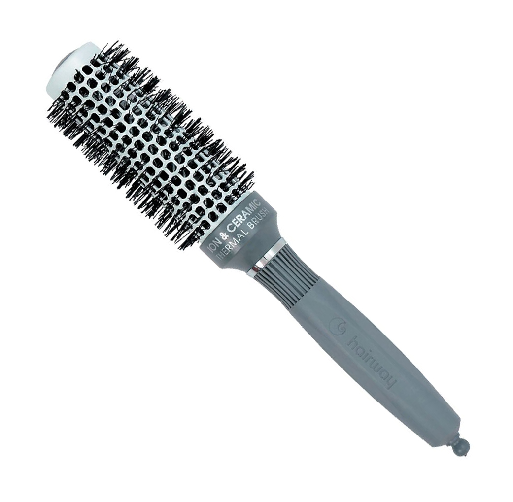 Профессиональный облегченный термобрашинг для укладки волос Hairway Ion Ceramic с керамико-ионным покрытиям втулки, нейлоновой щетиной и прорезиненной ручкой для комфортного использования. Брашинг имеет овальные отверстия для более интенсивного прохождения горячего потока воздуха, сокращая тем самым время укладки. Многогранная прорезиненная ручка позволит надежно удерживать термобрашинг во время укладки волос. Разделитель прядей облегчит вашу работу.