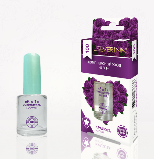 Эксклюзивная формула средства 5 в 1 укрепитель, базовое и верхнее покрытие от Severina восстанавливает повреждённую ногтевую пластину, предотвращает её нежелательную пигментацию, склеивает отошедшие кромки слоящихся ногтей, защищает от потери влаги.