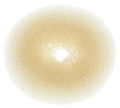 В прическе совершенно не виден. Для ее создания волосы собирают в хвост, который пропускают через кольцо. Оно совершенно безопасно для волос. Затем всю их массу распределяют по поверхности валика и закрепляют резинкой.