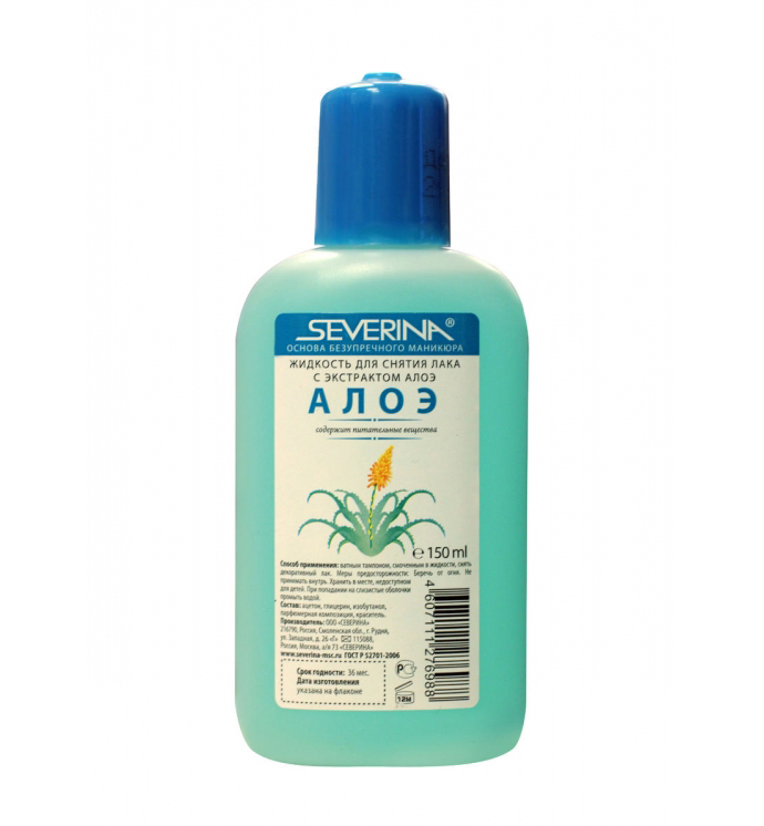 Жидкость для снятия лака без ацетона с Алоэ Severina не только обеспечат уход за кожей рук и ногтями, но и сделают процедуру очистки ногтей приятной. Средство подходит для натуральных ногтей.